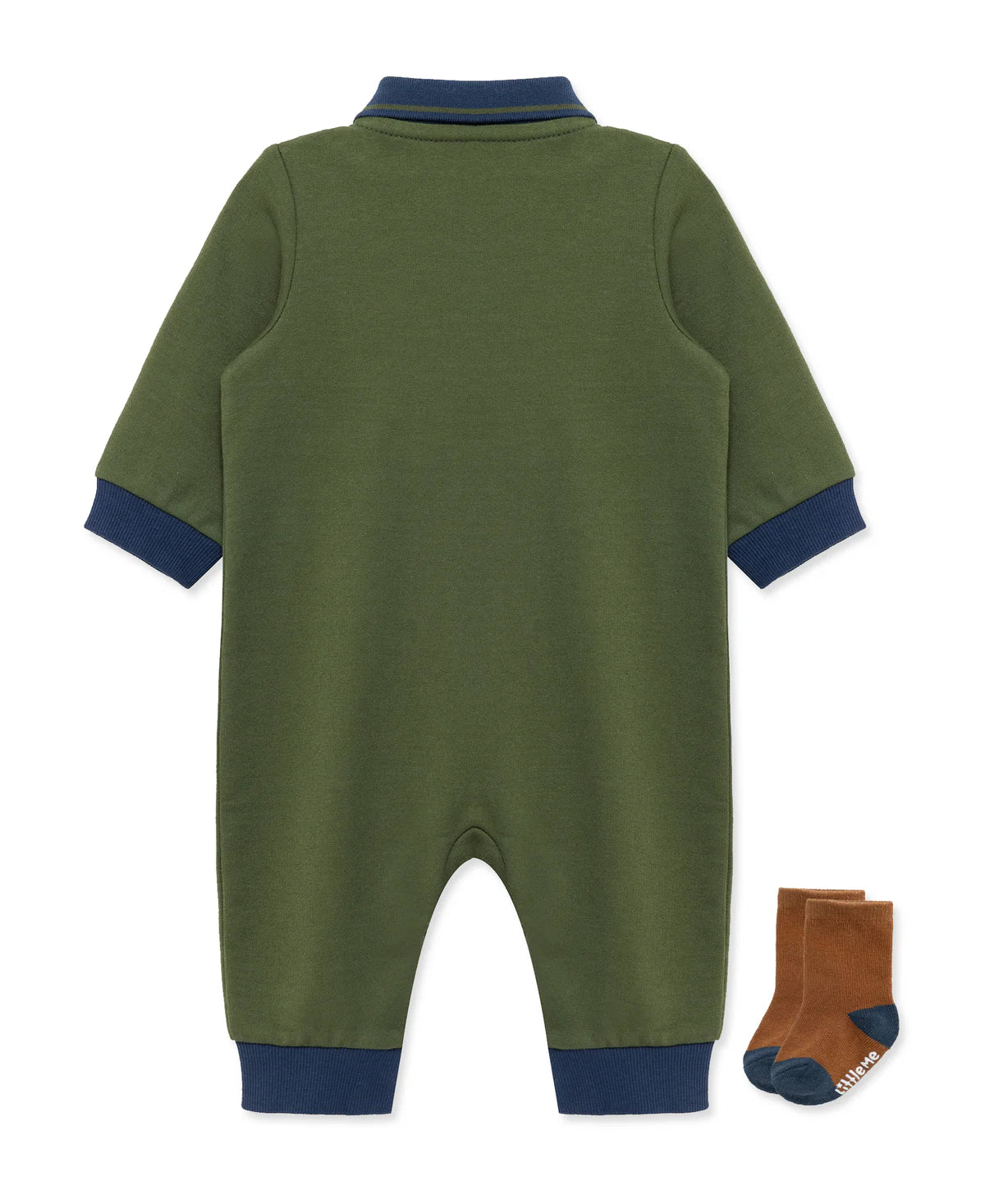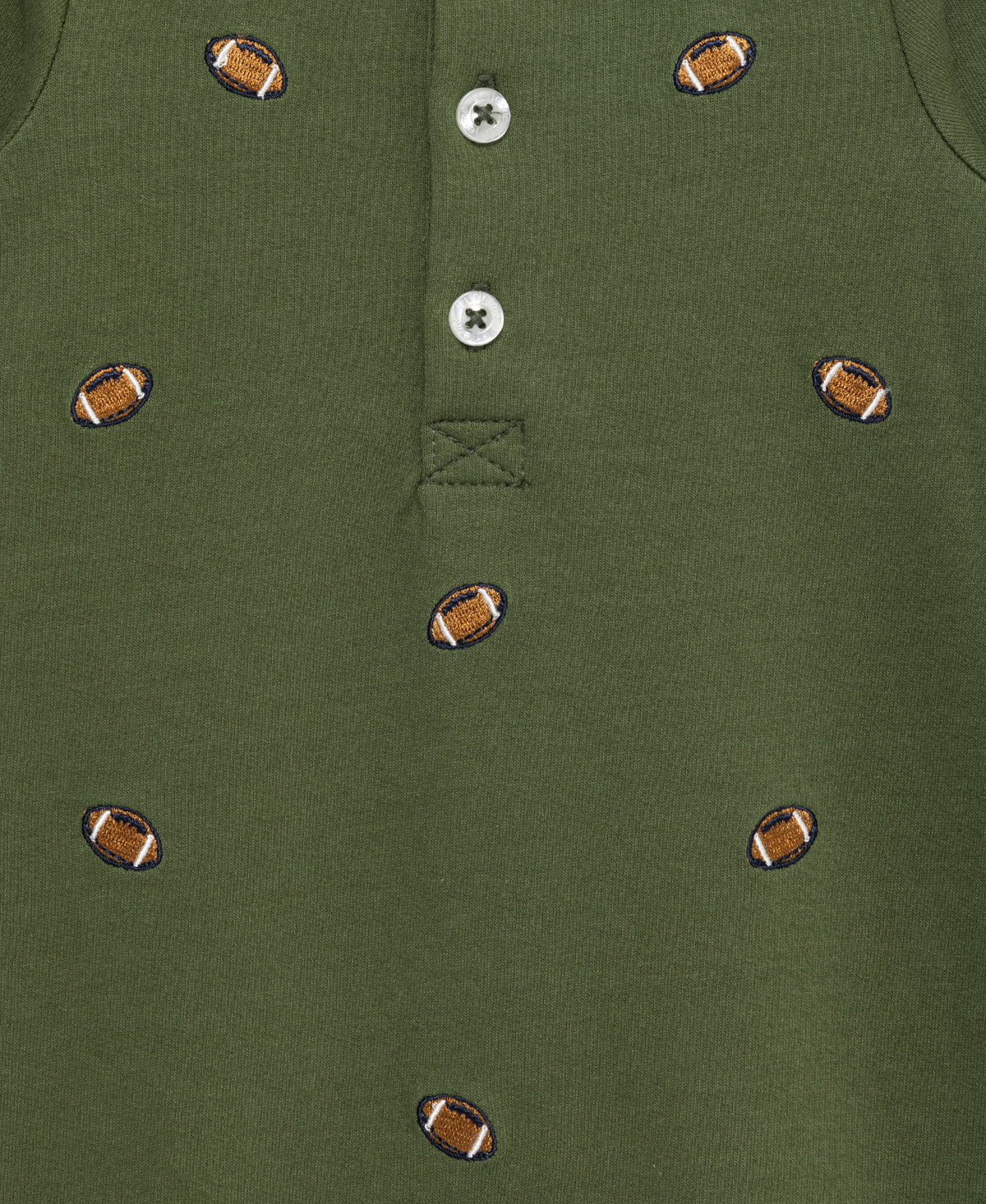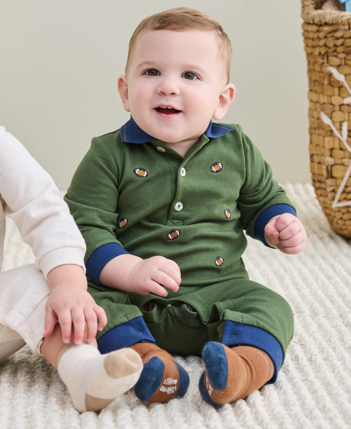 A football theme comfy collared coverall that gives your baby boy room to explore, with leg snaps for quick and easy diaper changes. Complete this comfy outfit with the matching socks.