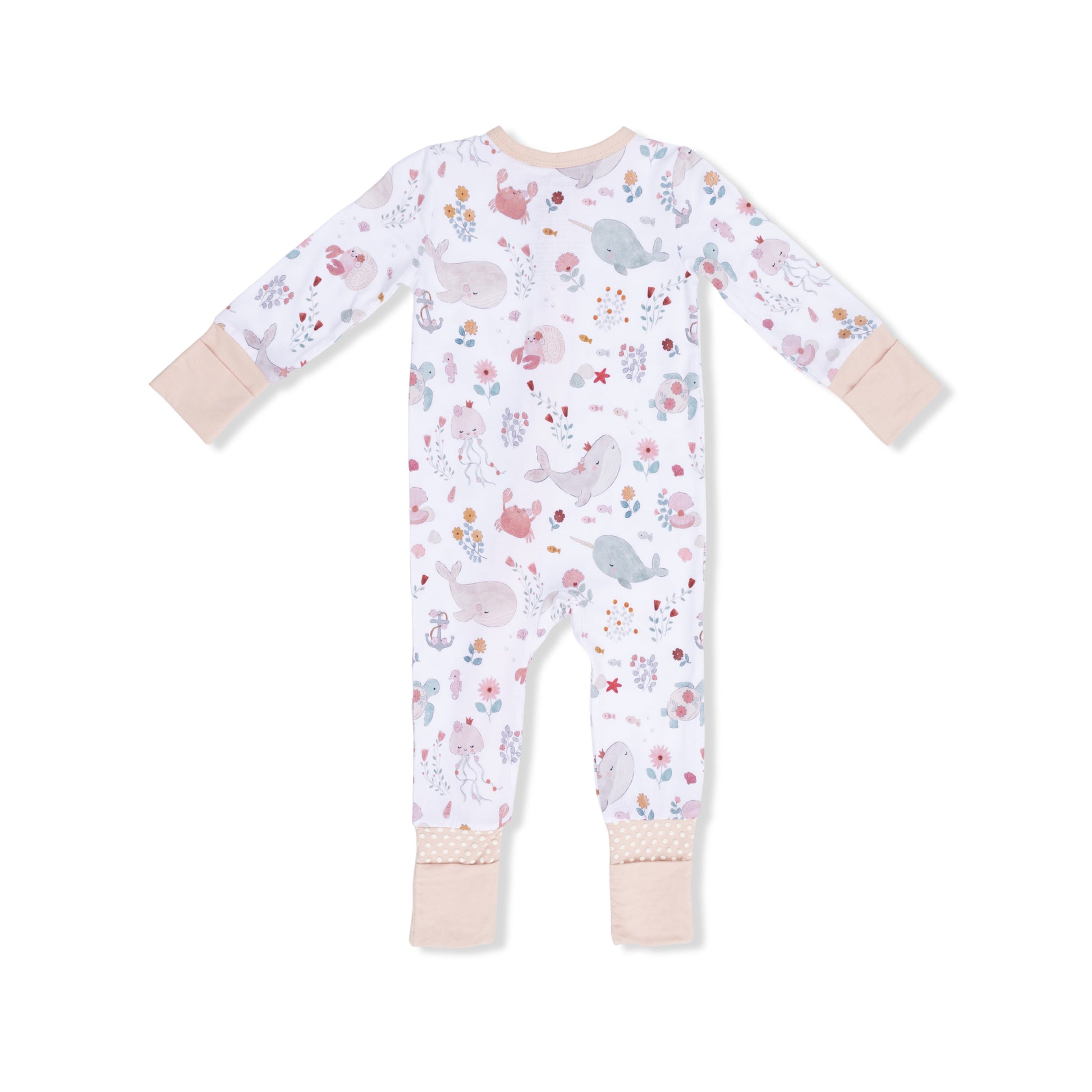 Trimmed in a sweet blush pink, this romper is designed with pastel sea creatures and florals that will melt your heartGarment/Care Details: