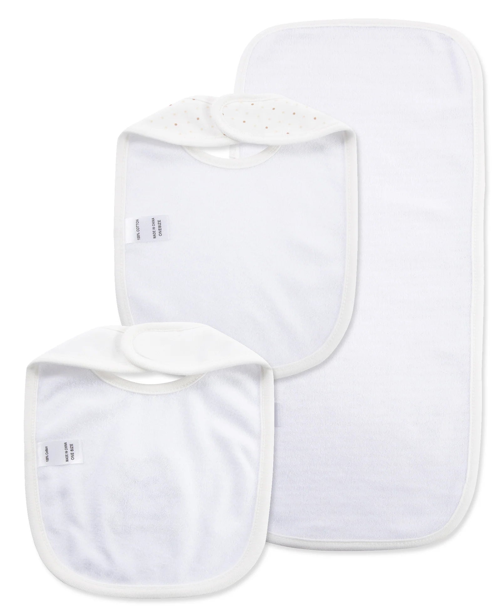 New moms will love this baby bib & burp set featuring two reversible cotton/cotton terry bibs and burp cloth, designed with a classic polka dot pattern and Bear appliqué.