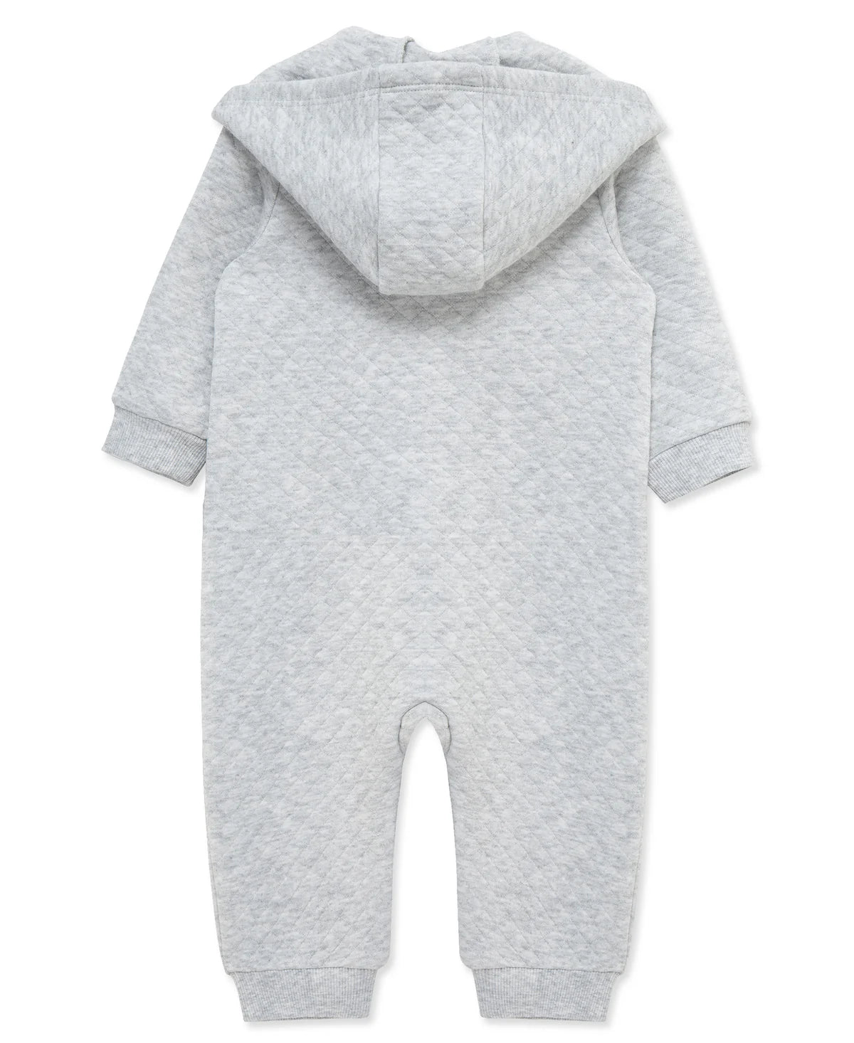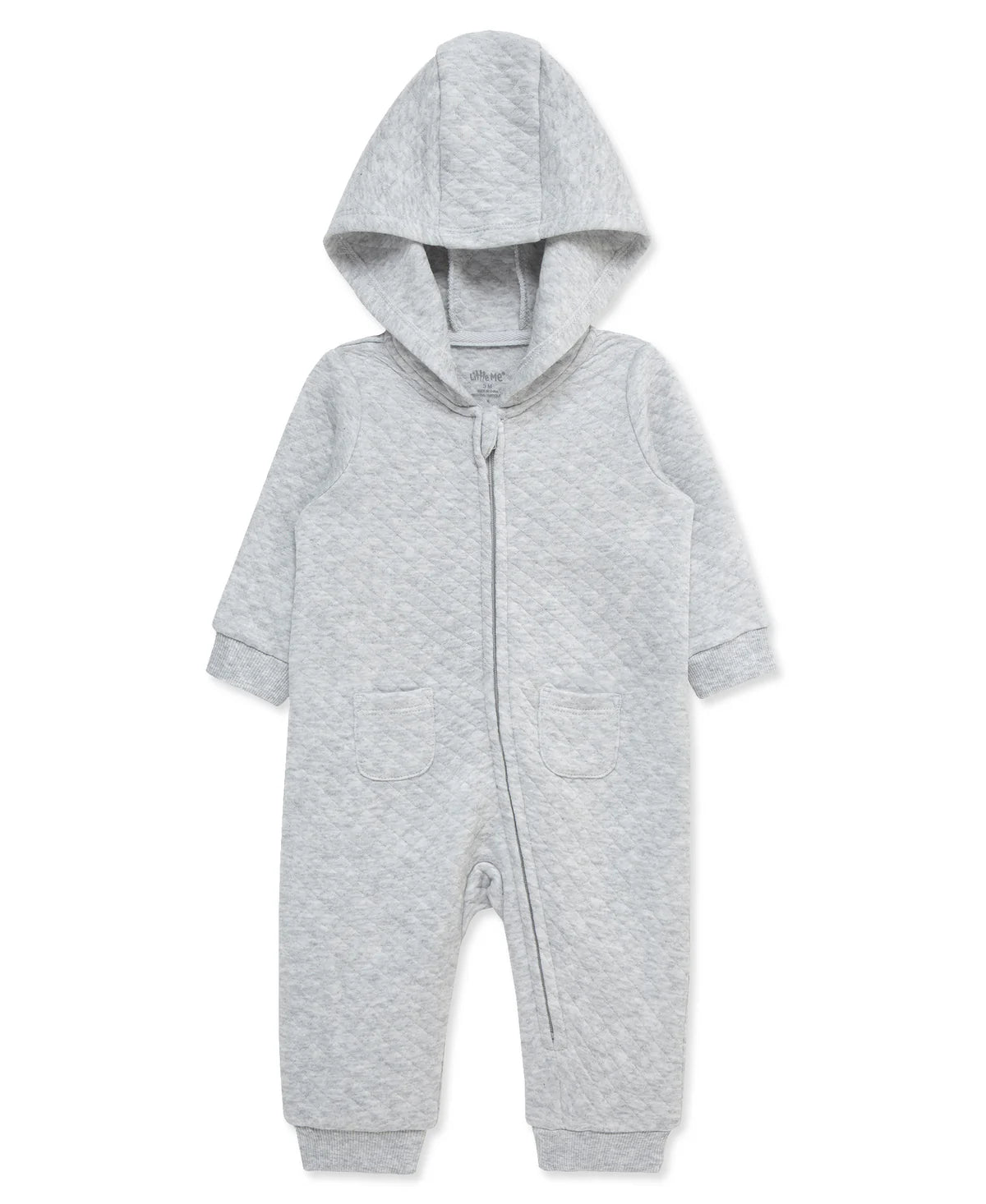 An essential in your little one's cold weather closet, our quilted, gray hooded coverall will keep baby cozy and warm. It features two pockets, a zip front, and diamond double knit.