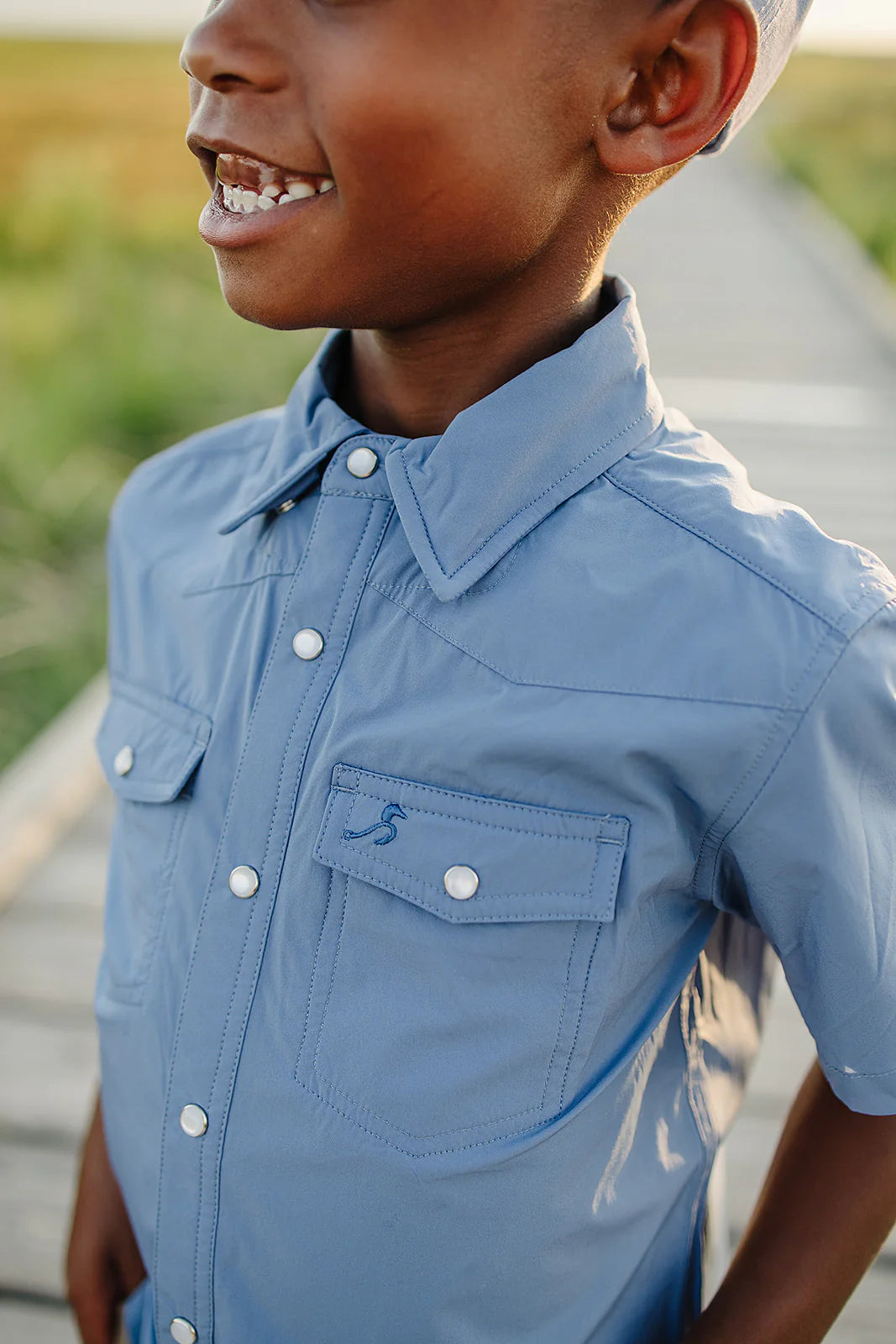 Introducing our all-new performance pearl snap shirt, where function meets style! Designed with classic Western detailing at the shoulders and pearl snaps for a timeless look, this shirt is perfect for fast moving boys and versatile occasions. Made from soft, lightweight, and breathable fabric, it features moisture-wicking technology, UPF 50+ sun protection, and a vented back to keep cool and comfortable. Additional snaps hold the collar in place for added convenience. Whether for outdoor adventures or special events, this shirt will be your go to favorite.